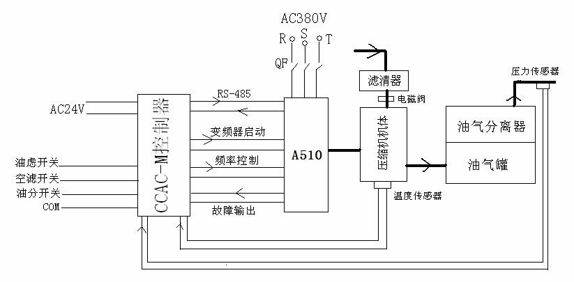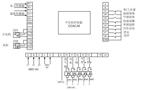 與變頻器組成空壓機控制系統時,用戶可選用東元空壓機控制器CCAC,也可選用普樂特控制器(內置東元變頻器驅動),本文主要講述臺安空壓機控制器CCAC與東元A510變頻器組成的控制系統在螺桿式空壓機上的應用。